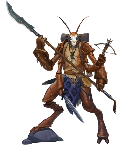 A thri-kreen resembled a giant praying mantis, bipedal and standing 4.5–7 feet (1.4–2.1 meters) high and weighing 100–375 pounds (45–170 kilograms a full-grown adult averaged at 6 feet (1.8 meters) and 200 pounds (90 kilograms). They had exoskeletons over their entire bodies. They had six limbs protruding from their thorax: two for walking and four for use as arms, ending in four-fingered claw-like hands capable of tool- and weapon-use. Their insectoid heads had two black, multi-faceted compound eyes; two small antennae sprouting from the top; and a complex jaw structure with large sharp mandibles. It was extremely difficult to distinguish the males and females.