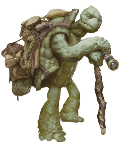 Tortles have a saying: “We wear our homes on our backs.” These turtle folk live on many worlds, most often journeying up and down coasts, along waterways, and across the sea. Tortles don’t have a unified story of how they were created, but they all have a sense of being mystically connected to the natural world. Carrying their shelter on their backs gives tortles a special feeling of security wherever they go, for even if they visit a far, unknown country, they have a place to lay their heads.