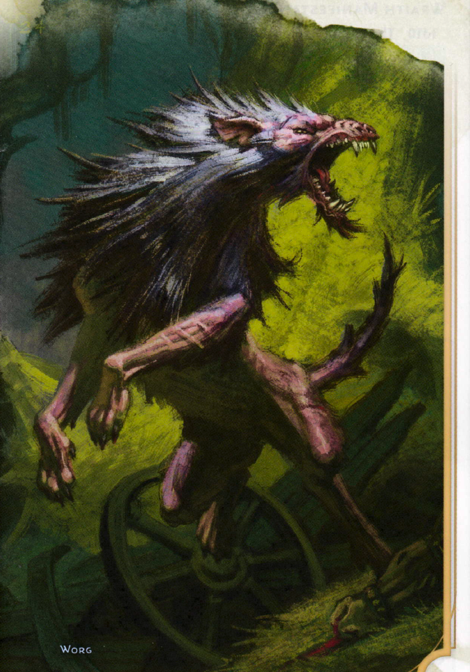 Sometimes mistaken at first for giant wolves, worgs are vicious hunters. These sapient predators can speak and often taunt their prey, enjoying the taste of fear in their meals.
