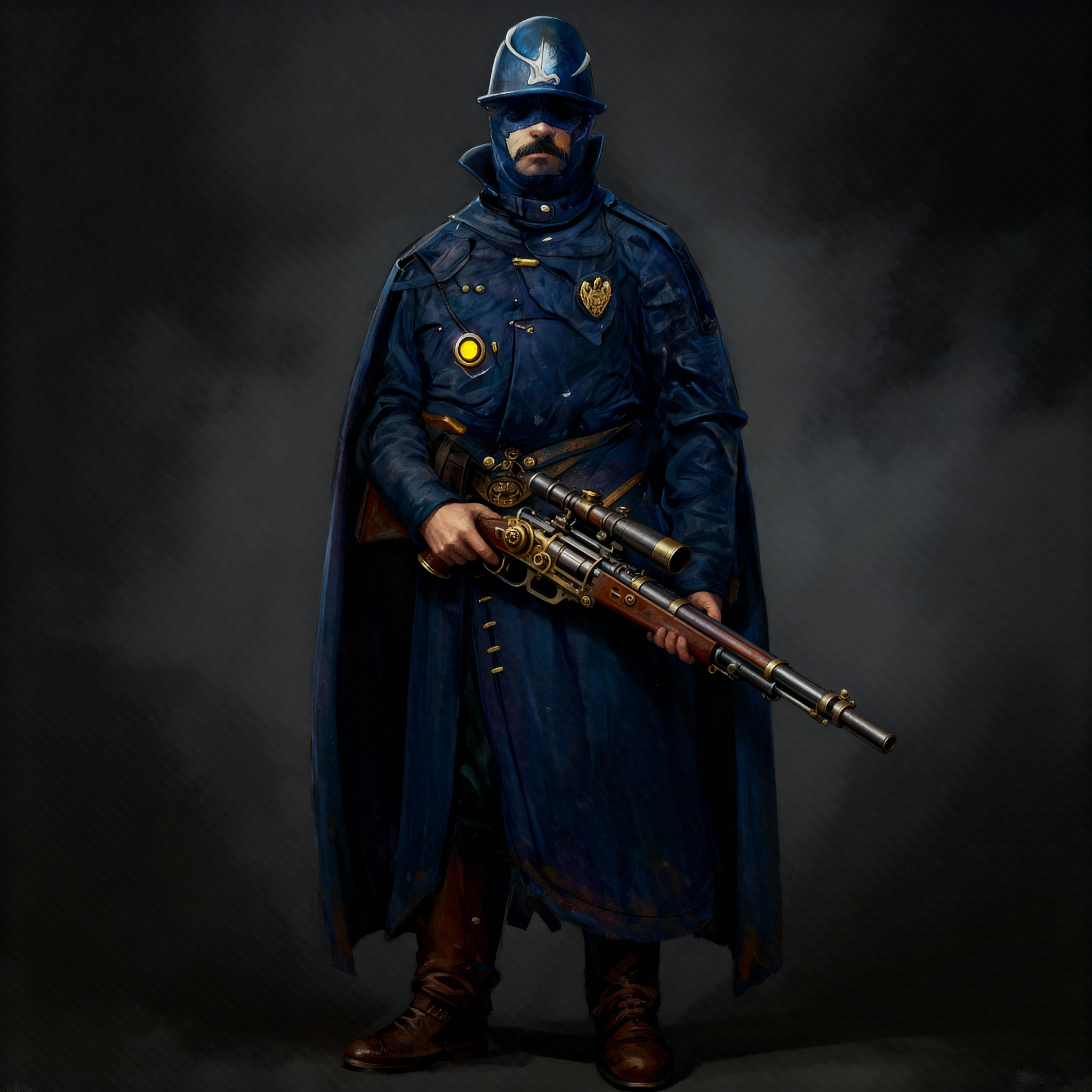 A constable with a scoped rifle and a dagger. Wears the dark blue uniform of the Mori Constabulary.