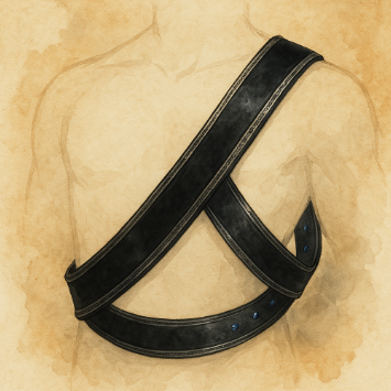 This bandolier is made from thin and dark leather which hugs the body tightly while worn. It is lined with a silver brim which has almost impossible to see runes written on it, and the bandolier has many small sapphires on its lowest belt.